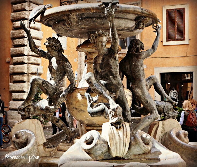Our first stop was at the pretty Fountain of the Turtles in Piazza Mattei. A Renaissance fountain, it is decorated with turtles and positioned in this small piazza named after the powerful Mattei family. Melanie had an interesting tale to tell regarding its provenance and the rain, now coming down hard, seemed of very little consequence.